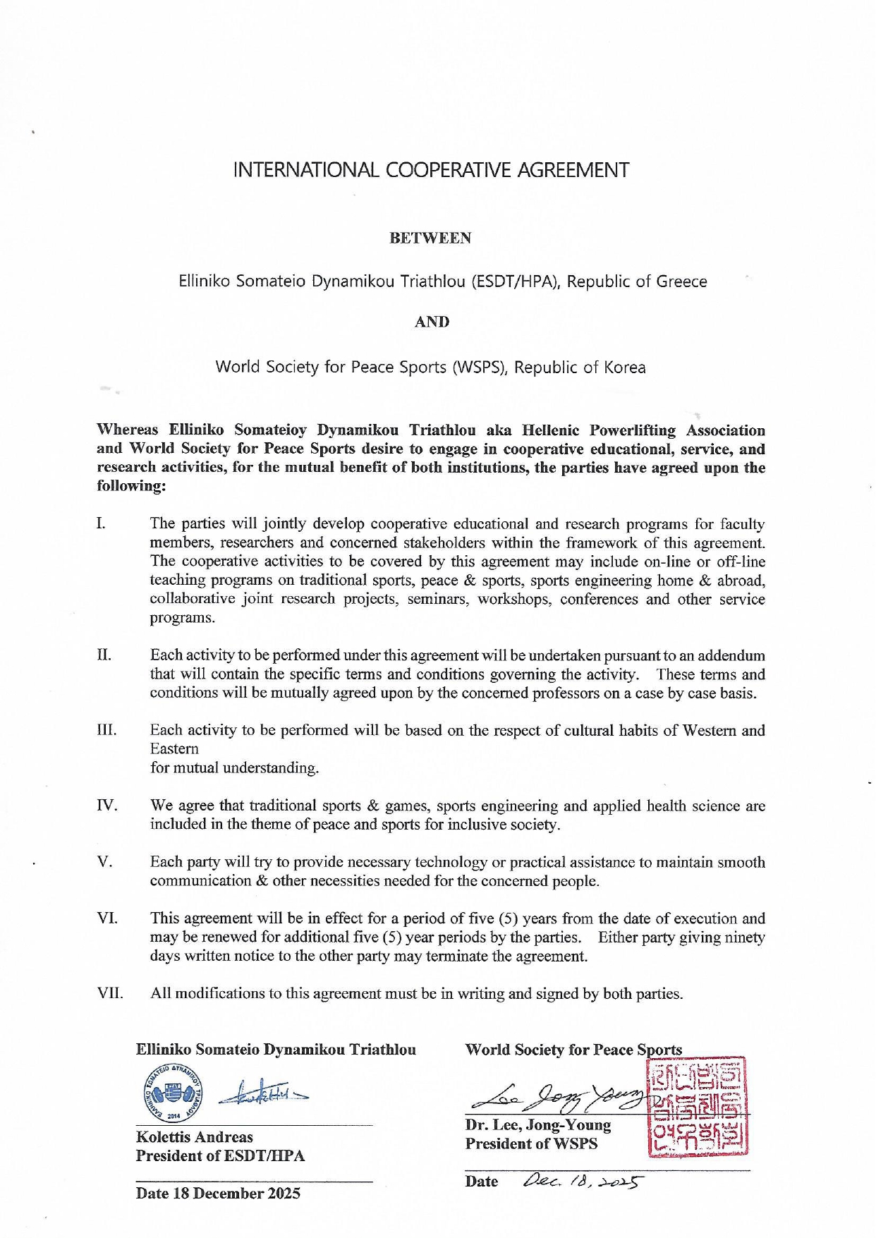 We are thrilled to announce that Elliniko Somateio Dynamikou Triathlou (ESDT/HPA), Greece, and the World Society for Peace Sports (WSPS), Republic of Korea, have officially signed an International Cooperative Agreement!