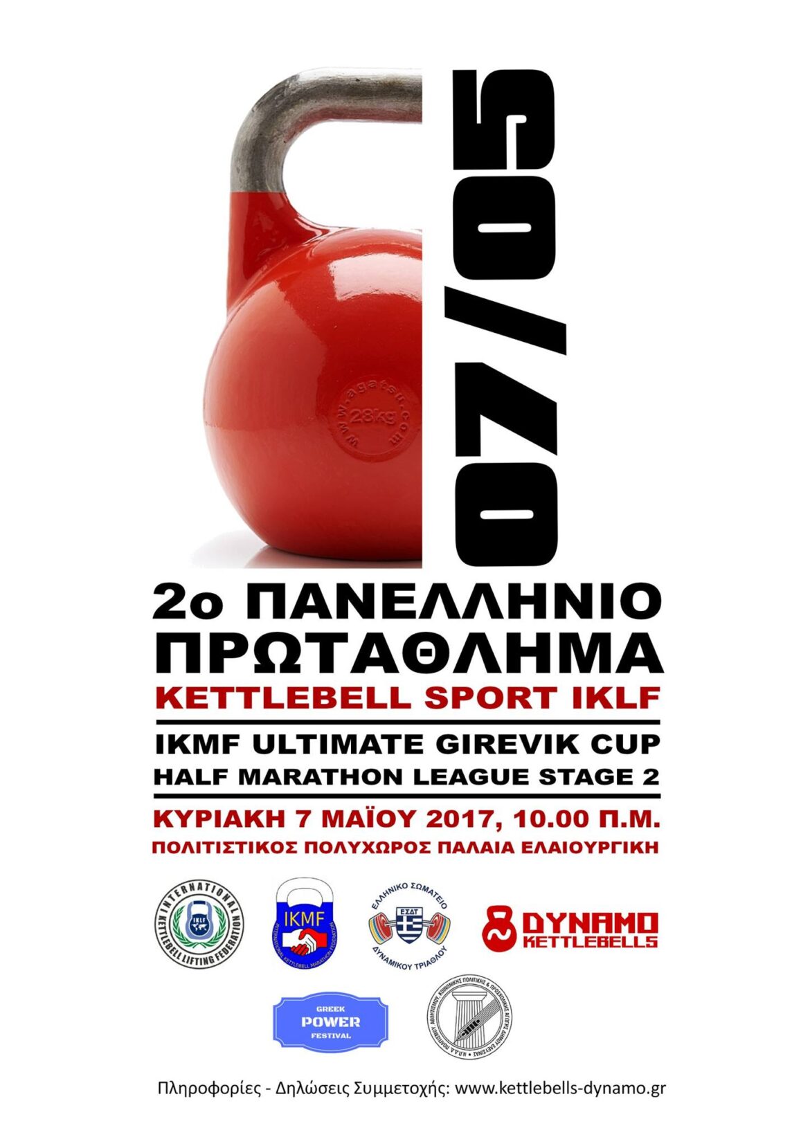 2ο Πανελλήνιο Πρωτάθλημα BOLT – Ultimate Girevik Cup 2017 Stage 2 (για τους αθλητές που δεν θα πάρουν μέρος στο 2o Πανευρωπαϊκό Πρωτάθλημα IKMF). Κυριακή 7 Μαϊου, 10.00 π.μ. στην Ελευσίνα, στο πλαίσιο του Greek Power Festival. Πληροφορίες – Δηλώσεις Συμμετοχής: https://kettlebells-dynamo.gr/2o-panellinio-protathlima-ke…/