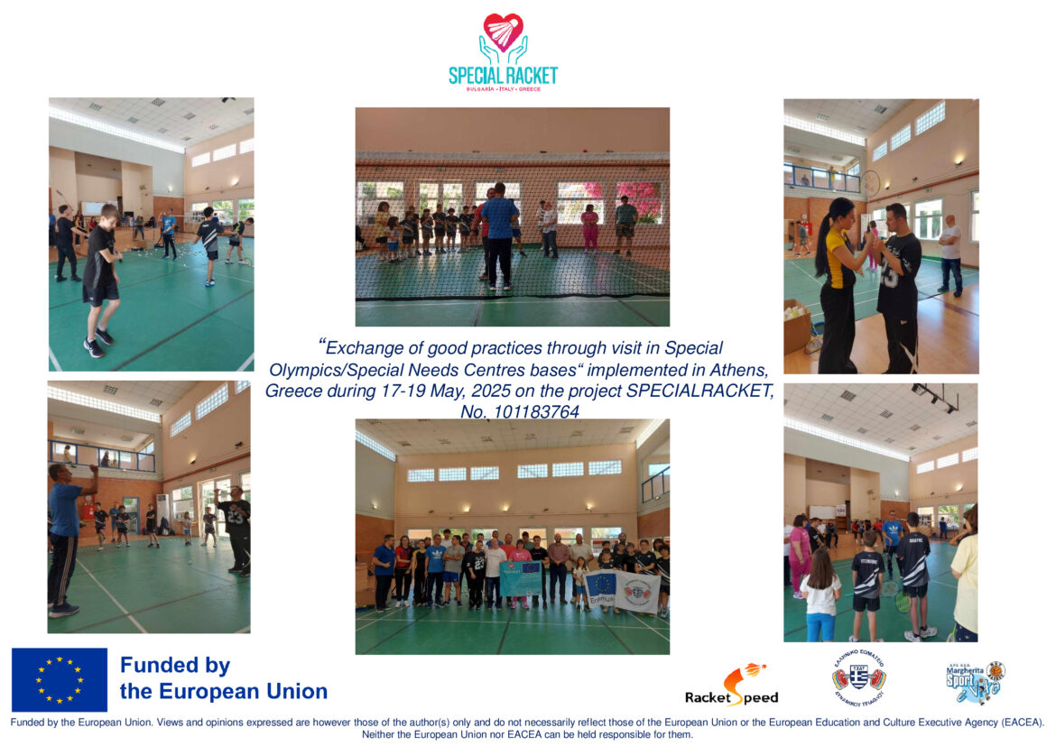 The first transnational meeting of the SPECIALRACKET Erasmus+ project, co-funded by European Union, took place in Lykovrysi, Attica, Greece, from 17 to 19 May 2025. The hosts (Hellenic Powerlifting – Ελληνικό Σωματείο Δυναμικού Τριάθλου) and partners from Бадминтон клуб Ракет Спийд – Racket Speed Badminton Club (Bulgaria) and Aps Asd Margherita Sport e Vita (Italy) met and had the opportunity through a theoretical and practical part to Exchange of good practices through visit in Special Olympics/Special Needs Centres bases in Greece.