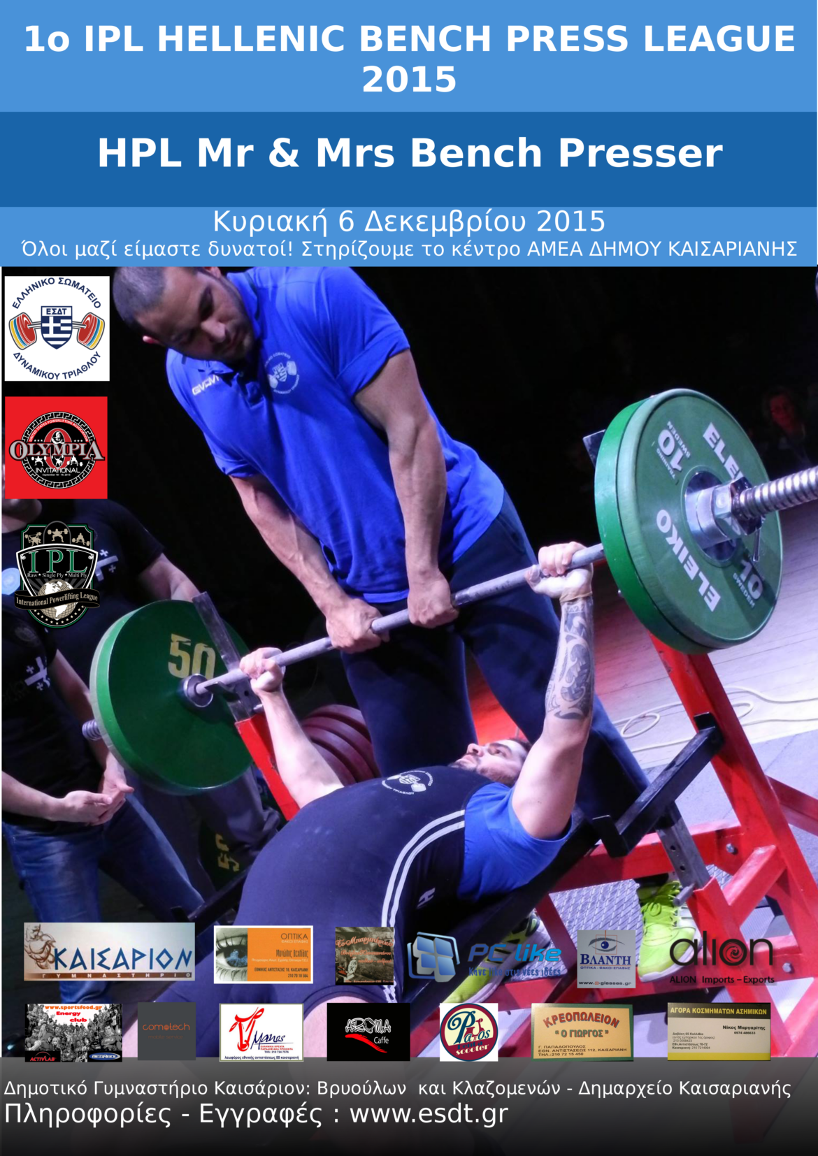 Το IPL Hellenic Benchpress League θα διεξαχθεί στις 6 Δεκεμβρίου 2015, στο Δημοτικό Γυμναστήριο Καισάριον, που βρίσκεται επί της οδού Βρυούλων & Κλαζομενών, με την ευγενική παραχώρηση του Δήμου Καισαριανής. Για το πρόγραμμα των αγώνων, θα ενημερωθείτε τη Δευτέρα 30 Νοεμβρίου 2015 από την Ιστοσελίδα μας (www.esdt.gr).
